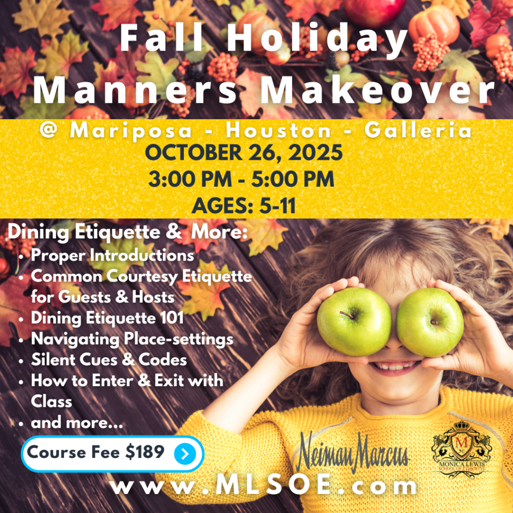 Just in time for the holidays…help has arrived. Get your kids ready for the holidays with our ever-so-popular workshop that offers boys and girls an opportunity to learn about proper social skills during any festivities. During this class, they will learn the importance of being a gracious guest, greeting people, introducing themselves, the importance of […]